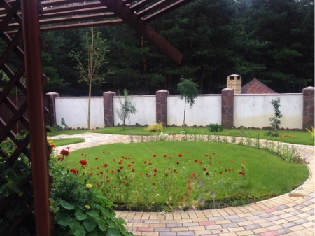 Довольно частым приемом в ландшафтном дизайне используется круг. Особенно выгодно такой прием может смотрется на небольших участках, типа таунхауса или каких других стесненных пространствах, но так же стоит заметить, что и на более крупных участках круг зачастую смотрится очень выгодно.На этом объекте выполнялись такие работы, как: